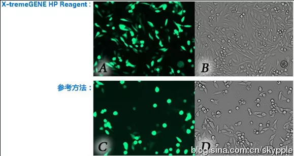 图2. X-tremeGENE HP高效低毒的转染性能。通过X-tremeGENE HP和脂质体转染方法将GFP表达质粒转染至CHO-K1。A和C图的荧光视野显示了实验后两种方法均获得了成功转染的细胞。但B和D图的明亮视野表明脂质体转染方法的细胞毒性远高于X-tremeGENE HP,导致存活细胞量减少(图片来源于网络)。